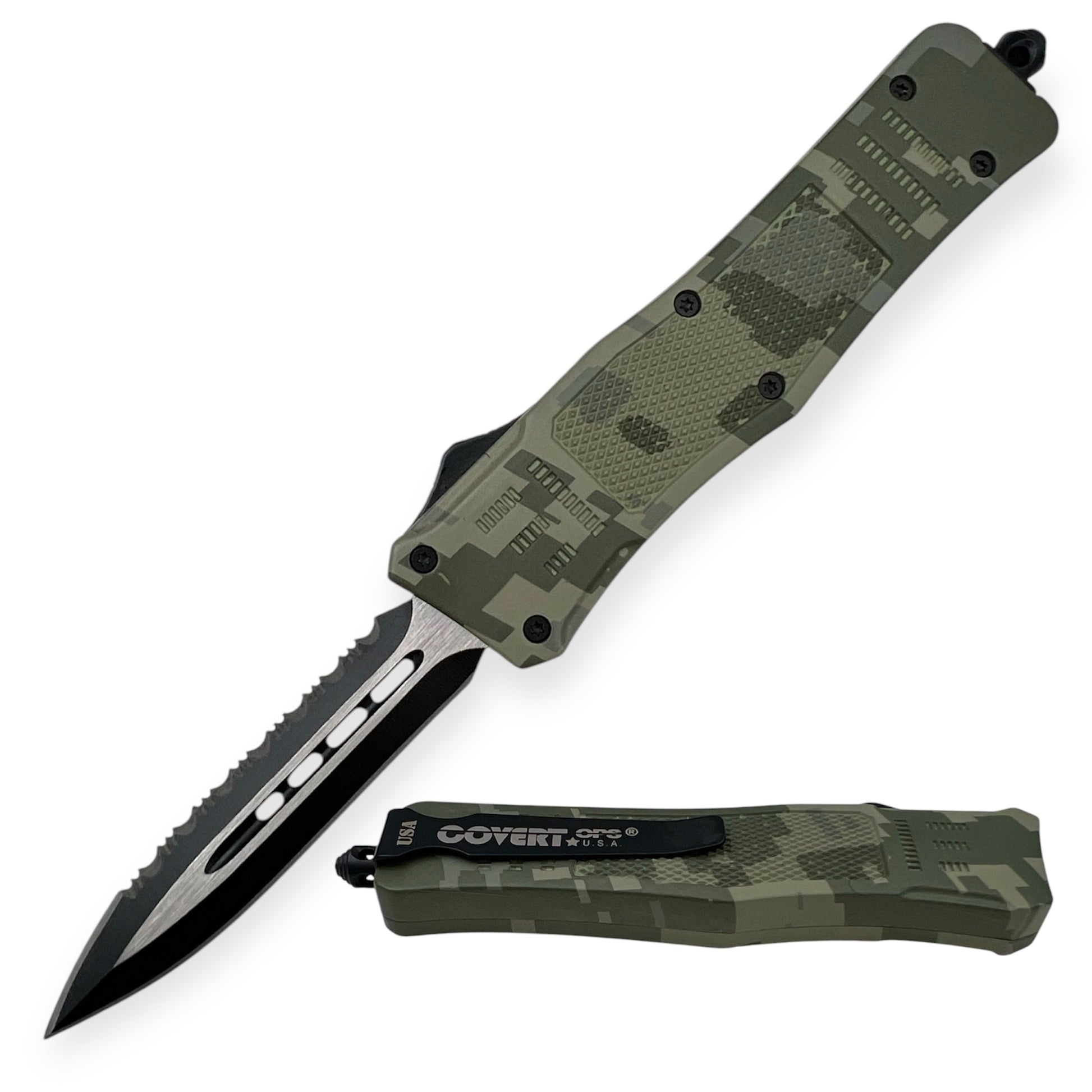 Covert Ops® OTF Automatic Knife 8 Inch Double Blade One side Serrated Camo