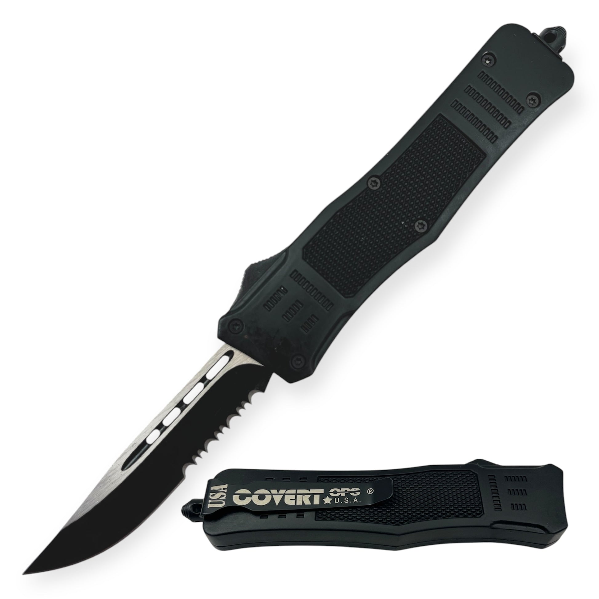 Covert Ops® OTF Automatic Knife 8 Inch Black Handle Drop Point Half Serrated Blade
